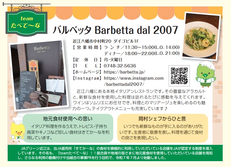 令和7年7月より開始、当JA直売所きてか~な等で地元食材を多くご利用いただいているお店を紹介しています。