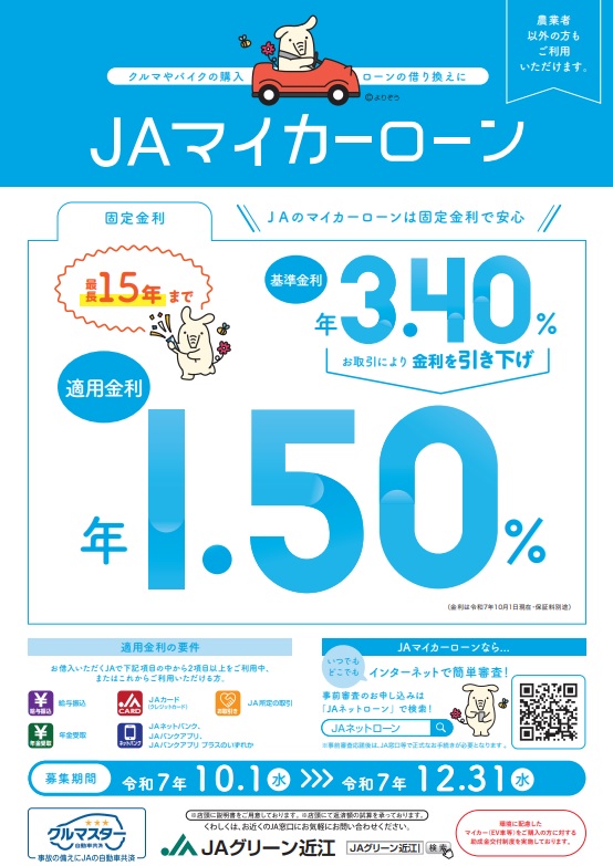 クルマやバイクの購入資金ならJAマイカーローン。他金融機関からのお借換にもご利用ください。