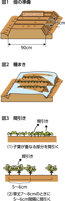 種まき2週間前に1平方m当たり苦土石灰100gをまいて畑をよく耕し、1週間前に化成肥料(NPK各成分で10%) 100gと堆肥2~3kgを施し、土とよく混ぜておきます。幅90cmの栽培床を作り、畝に直角に条間15~20cmの種まき溝を切ります。このとき、まき溝は支柱や木板を土に押し付け、溝を付けると深さが一定になります(図1)。