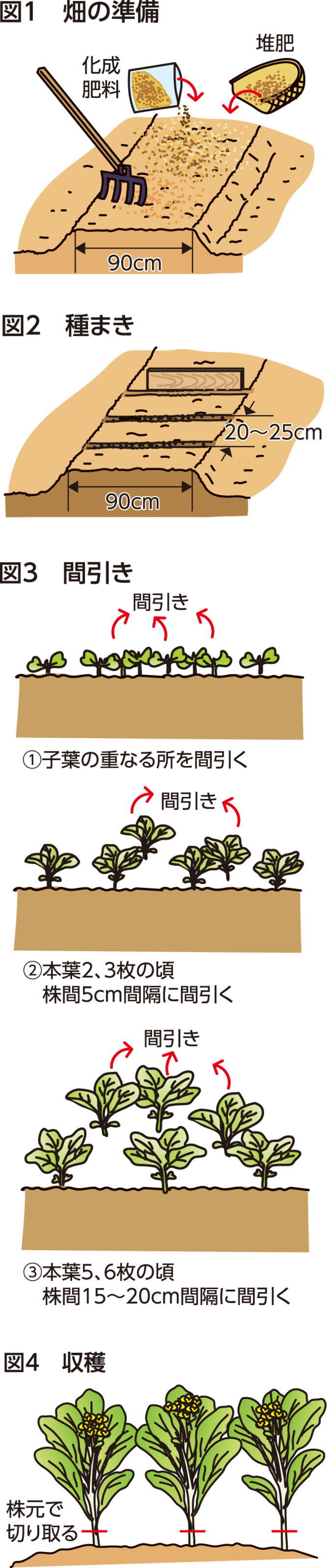 [畑の準備]あらかじめ土の酸性を改善するため、1平方m当たり苦土石灰100gをすき込んで耕しておきます。次に、種まきの1週間前に幅90cm程度の栽培床(ベッド)を作り、1平方m当たり化成肥料(NPK各成分10%)100gと堆肥2kgを全面に施し、土と混ぜ、くわでベッドを平らにならします(図1)。